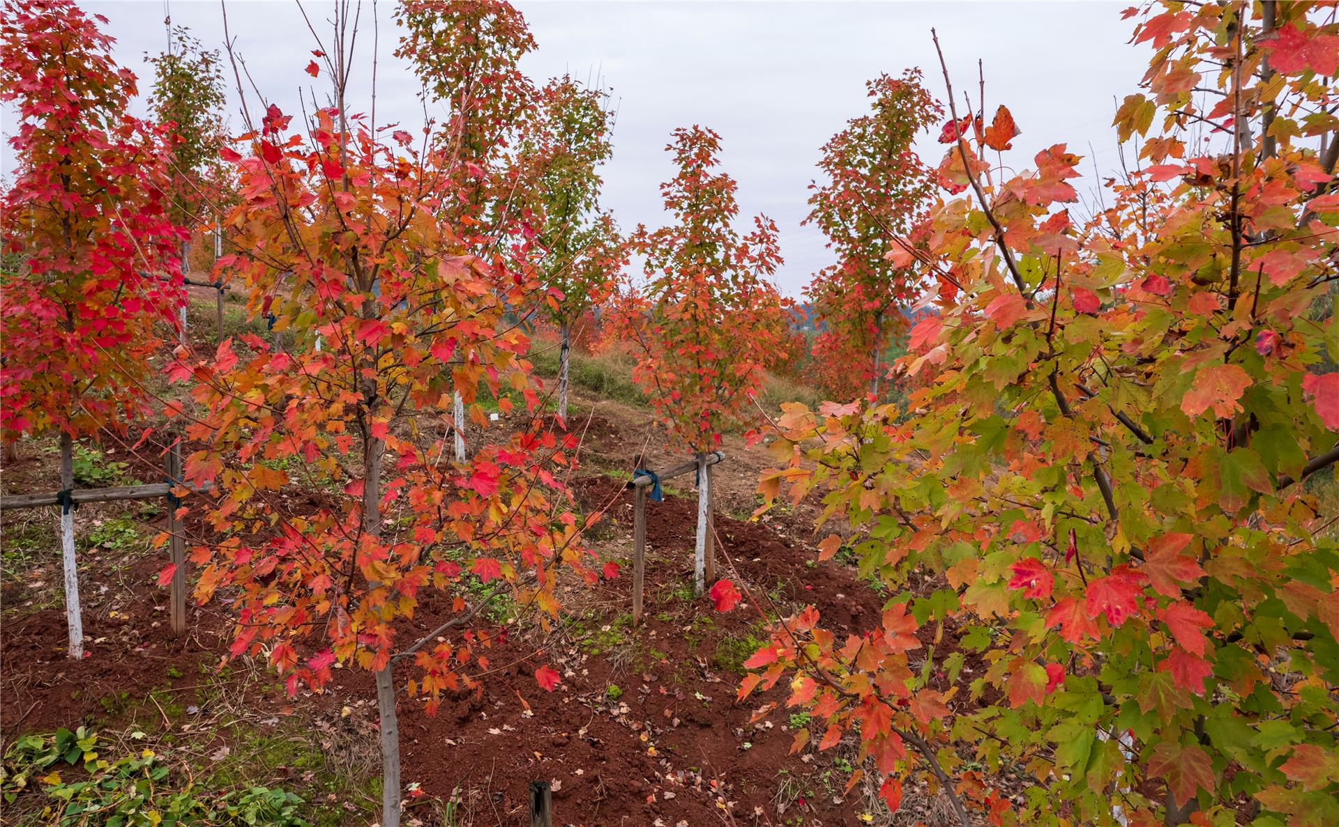 11月26日,銅梁區(qū)西郊紅楓基地,一株株紅楓樹陸續(xù)換上“紅裝”。不少坡地上的紅楓樹,已經(jīng)呈現(xiàn)出黃紅、橘紅、淺紅、大紅的顏色,猶如晚霞棲