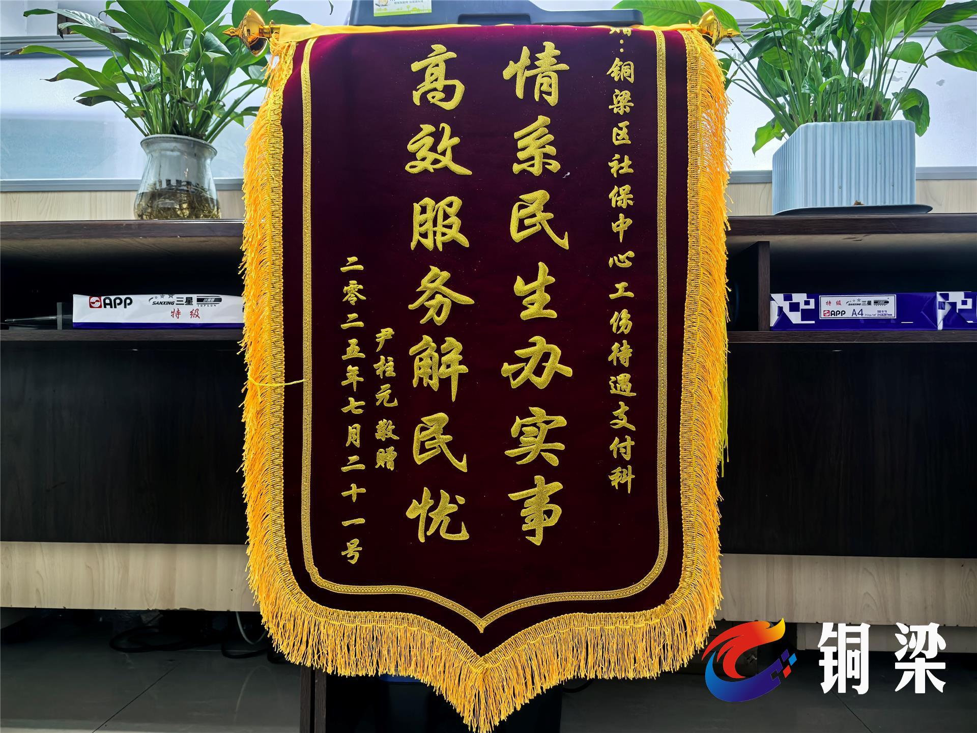 7月21日,一面書寫著“情系民生辦實(shí)事 高效服務(wù)解民憂”的錦旗,送進(jìn)了銅梁區(qū)人力社保局社保中心工傷保險(xiǎn)待遇審核科,市民尹柱元以此感謝