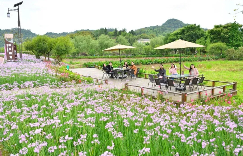在全國鄉村旅游重點鄉鎮——銅梁區土橋鎮,從荷和原鄉景區入口處,沿著藕田邊開滿鮮花的木質棧道直走,道路拐角處的幾處農家小院,就是田園